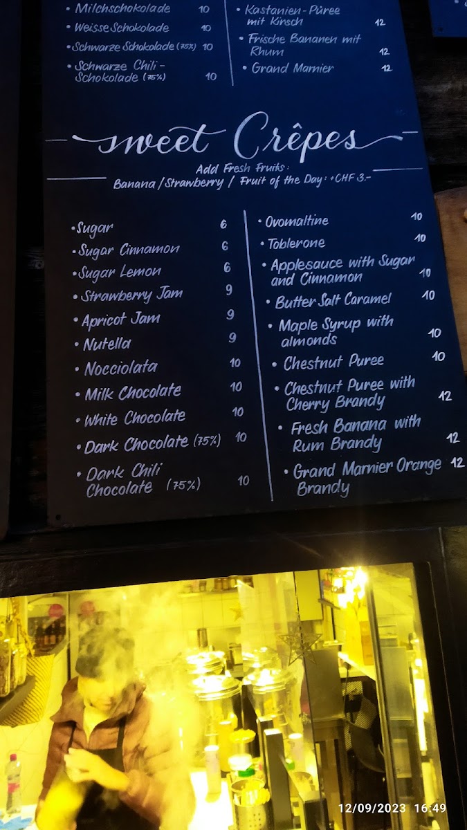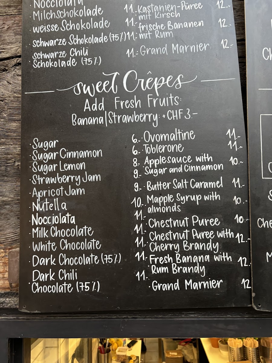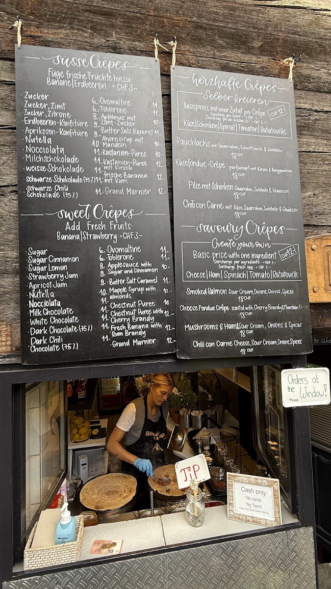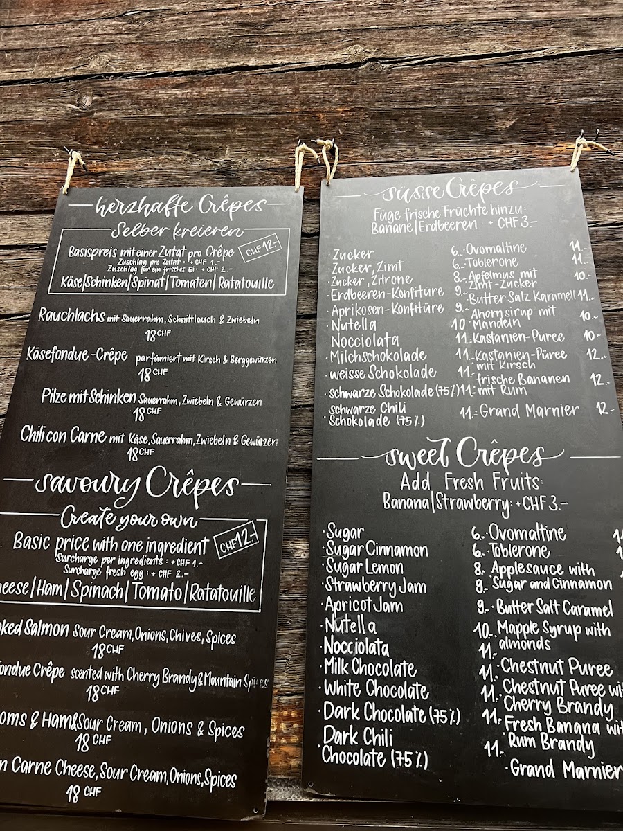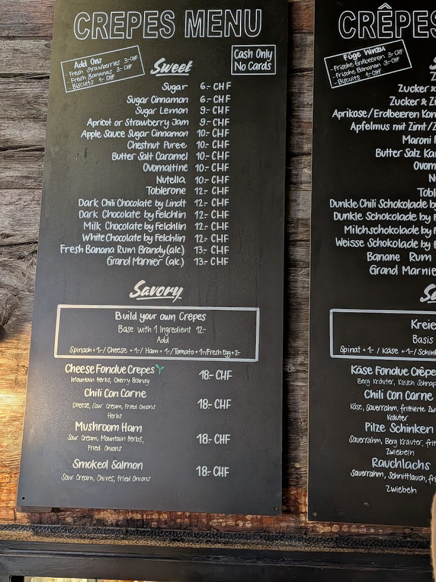 Stefanie's Crêperie offers a delightful range of sweet and savory options that showcase the versatility of crêpes. One standout dish is the Basisforeis Pro Crêpes, a rich and satisfying creation that promises a perfect balance of flavors. For those seeking something with a little more bite, the 蘑菇 起 司 火腿 is an excellent choice, blending mushrooms, cheese, and ham in a wonderfully savory combination. The Spinach Crepe is another great savory option, with fresh spinach and creamy filling providing a light yet flavorful experience. Sweet-tooth cravings are well-catered for with indulgent selections like the Chocolate Sauce Banana with Almonds, a heavenly mix of bananas and chocolate, topped with crunchy almonds for texture. Finally, the Crêp de Chocolate delivers the ultimate chocolate lover's treat, combining rich chocolate with the delicate texture of a crêpe. Whether you prefer something savory or sweet, Stefanie’s Crêperie offers a menu that guarantees a delicious and satisfying meal in the heart of Zermatt.
